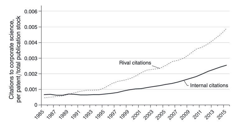 The figure above shows the increase in patents citing corporate science since the mid-1980s. Back in 1990, it was just as common for patented products to cite internal research (the solid black line) as science produced by rivals (dashed line). But that changed in the decades that followed. By 2015, rival citations were twice as likely as internal citations.