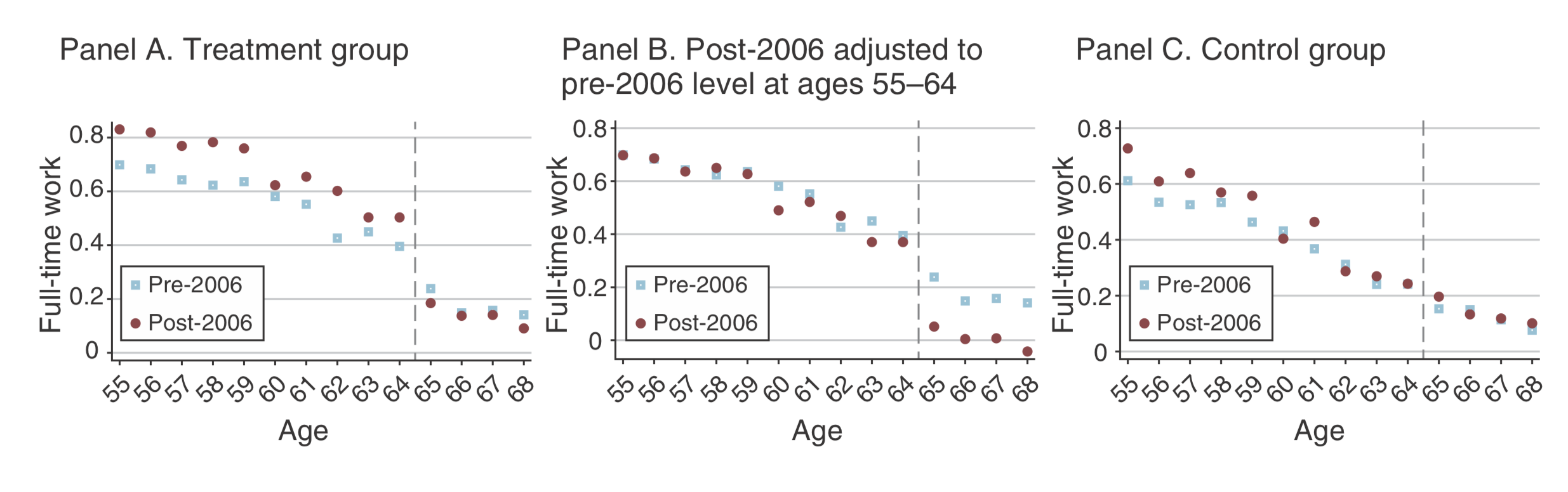 To estimate the impact of this new policy, Wettstein used a triple-differences design that compared individuals with retiree health insurance up to age 65 to those with insurance for life, before and after age 65, before and after 2006.