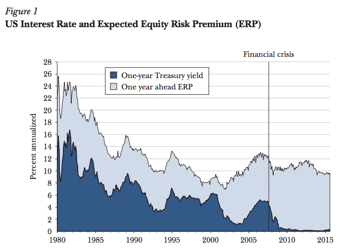 The return on equity essentially followed the same path as short-term rates for decades. That began to change around 2002, and especially after the Great Recession, short-term rates plummeted even as the expected return on equity remained stable.