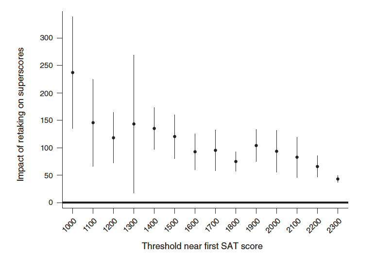 Figure 4 from their paper shows the estimated impact of retaking the test on a range of “superscores” — the combined top scores for the separate writing and math sections—under the old 2400-point format. (It reverted back to its old 1600 point scale several years ago.) Retaking the test improved scores for all students, but particularly those with lower initial scores. Low-scoring students’ second take combined scores were 91 points higher than their first, compared to a 22-point gain for students at the higher end of the spectrum. On average, retaking increased low-scoring students superscores by 136 points, relative to 84 points for higher-scorers.