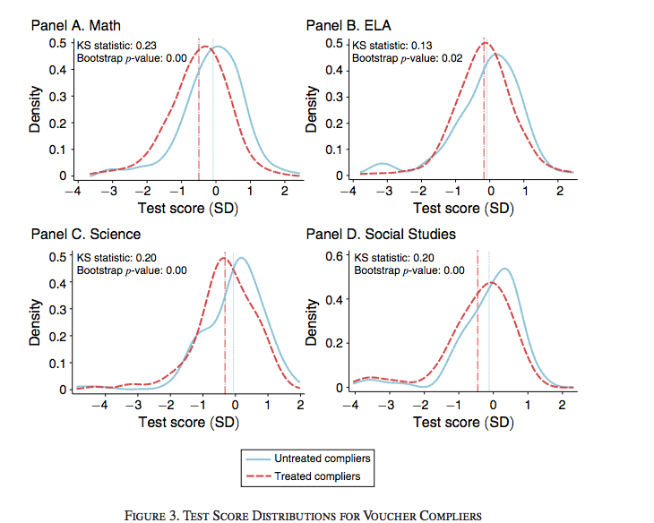 Atila Abdulkadiroglu, Parag Pathak, and Christopher Walters examine the academic performance of students who participated in the program in a paper that appears in the January issue of American Economic Journal: Applied Economics. Figure 3 from their paper shows the distribution of students who change enrollment because they won the voucher lottery and compares their performance on standardized tests to those who lost the lottery.