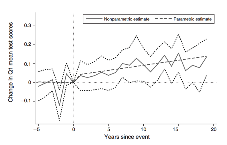 The evidence indicates it did, according to the authors. The figure above plots how the poorest districts performed on the National Assessment of Educational Progress exam before and after the reform. There was an immediate bump in test scores in the first few years after the policy went into effect, indicated by the vertical dotted line. Average test scores sloped upward over the following two decades.