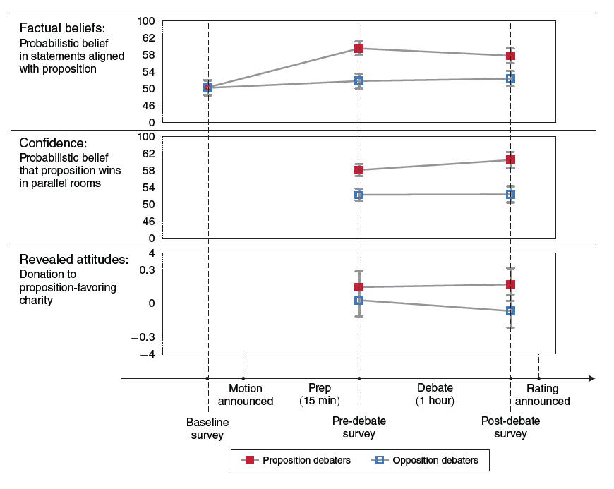 Figure 1 from their paper shows how debaters’ factual beliefs, confidence, and attitudes changed during the competition. Before knowing which side they would be assigned to argue (the dotted line at left), debaters were equally as likely to believe in the factual accuracy of a proposition. But that changed once they were assigned a side (center dotted line). In a pre-debate survey conducted 15 minutes into their preparation, debaters arguing for a proposition (red squares) became more convinced of the factual accuracy of that proposition, opening a gap of 7 percentage points with the opposition. The gap narrowed slightly when surveyed after the debate (right dotted line), but still persisted at around 5 percentage points.