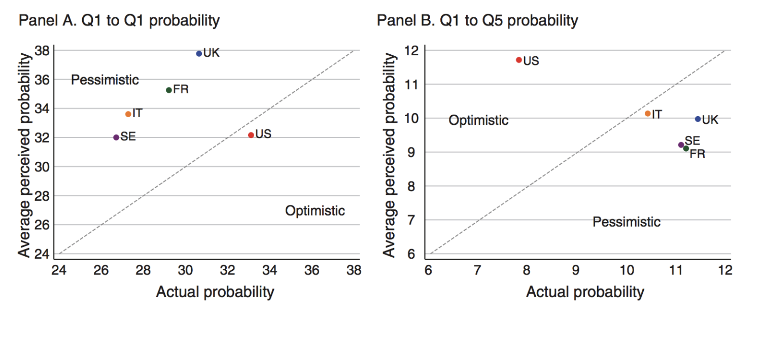 Authors Alberto Alesina, Stefanie Stantcheva, and Edoardo Teso survey people across five countries — France, Italy, Sweden, the United Kingdom, and the United States — and document their beliefs. Americans overestimate the likelihood of being extremely mobile and underestimate the likelihood of remaining stuck in the bottom quintile.