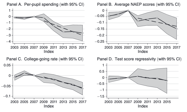 The bottom right panel shows the impact on test score gaps by district-level poverty in states where public schools were heavily reliant on state revenues. While there was little evidence of a pre-existing trend prior to 2007, the slope turned downward in the years following the recession.