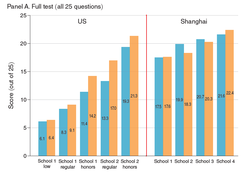 Panel A from Figure 1 in their paper shows the results. The aqua bars represent students who received no financial incentive, and the orange are those who received the financial incentive. They are categorized by learning track--including low performing, regular, and honors. The incentives were positive for every group of US students, across a wide range of abilities, though most pronounced for those in the middle-of-the-pack. Among Shanghai students, there were only small differences between the control group and those who received incentives, and virtually no difference at the low end.