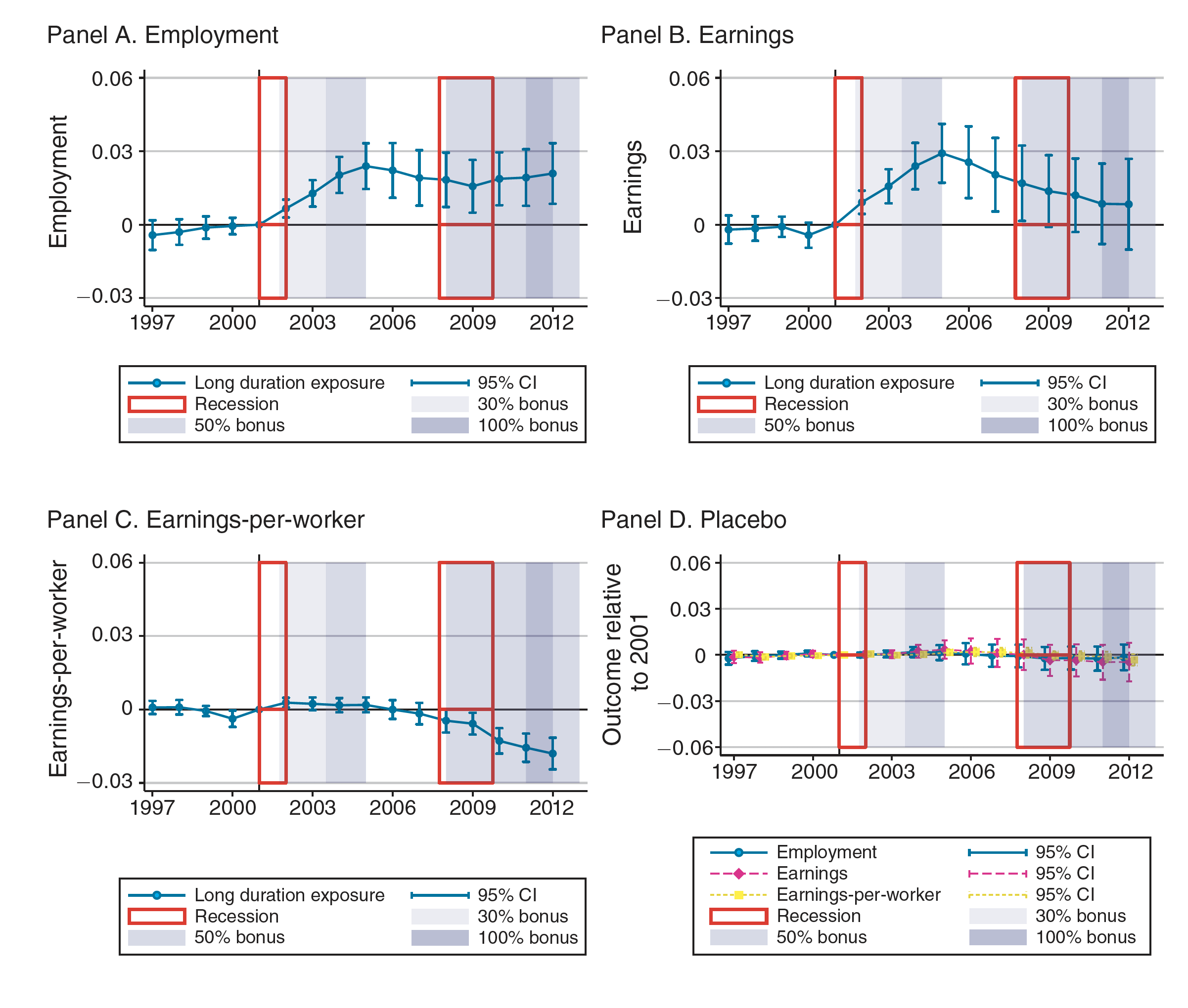Panel A shows that there was an uptick in jobs for counties that had companies with more exposure to the bonus depreciation law that started in 2002. This leveled off when the policy was ended, but then picked back up in 2008 when it was re-implemented. Total earnings for workers, in Panel B, shows a similar pattern.