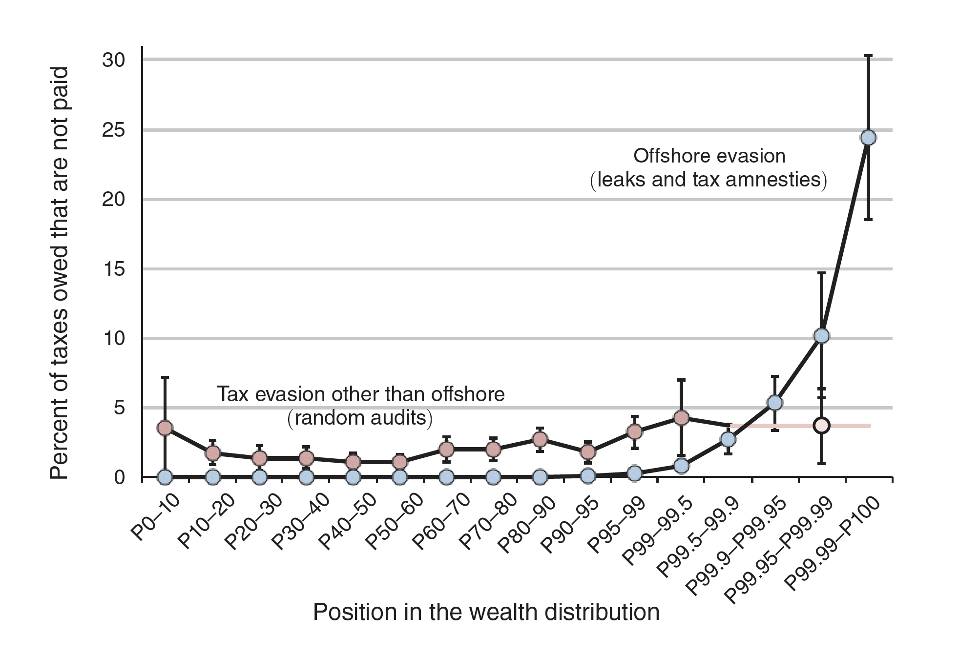 The blue circles show how much tax avoidance occurs through offshore accounts for each percentile of wealth. The pink circles represent how much tax evasion Scandinavian administrators found in random audits, which look for things like mistaken claims and misreported income but don’t search for offshore evasion. (Due to insufficient data, the last pink dot on the right represents the 0.5 percent wealthiest households.)