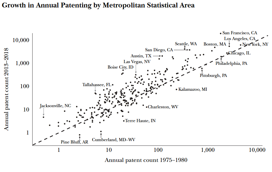 The figure shows patenting activity in various cities during two five-year periods — the late 1970s, and then 2013-2018. For the most part, cities that were already pumping out a lot of patents (like San Francisco, New York, and Boston) in the ‘70s have continued to stay ahead of the pack decades later. Overall, patenting activity has picked up steam, as represented in the chart by cities located above the 45-degree dashed line. A few cities have been growing especially fast in recent years. Seattle, San Diego, and Austin, Texas, are much more successful than they were in the late 1970s. Unfortunately, not everyone has seen better times. Patent activity in Kalamazoo, MI, and Charleston, WV, has slowed down.