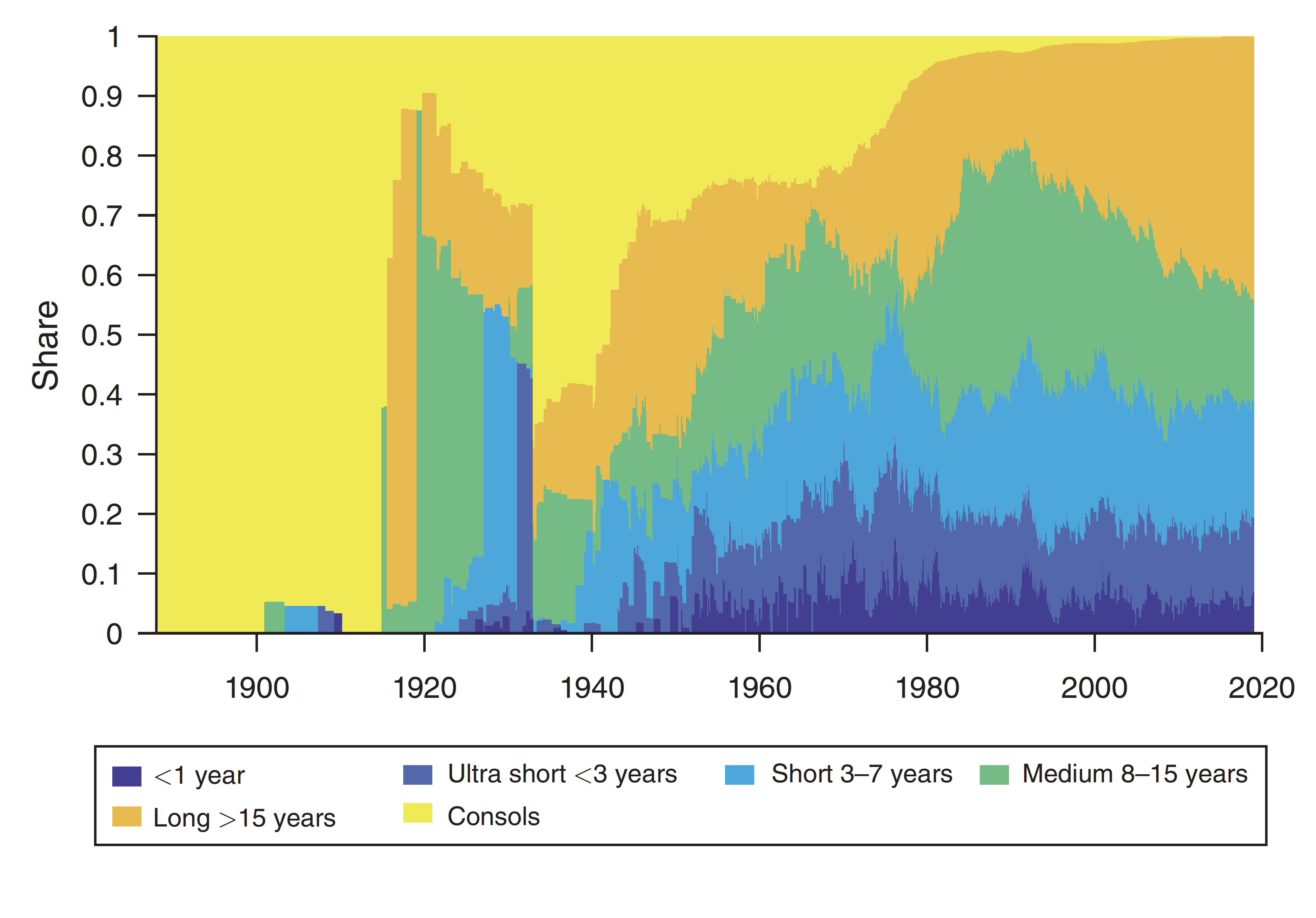 Starting in the early 20th century, the UK moved from using so-called consol bonds (yellow area), which have no maturity date, to a mixture of short-term, medium-term, and long-term bonds.