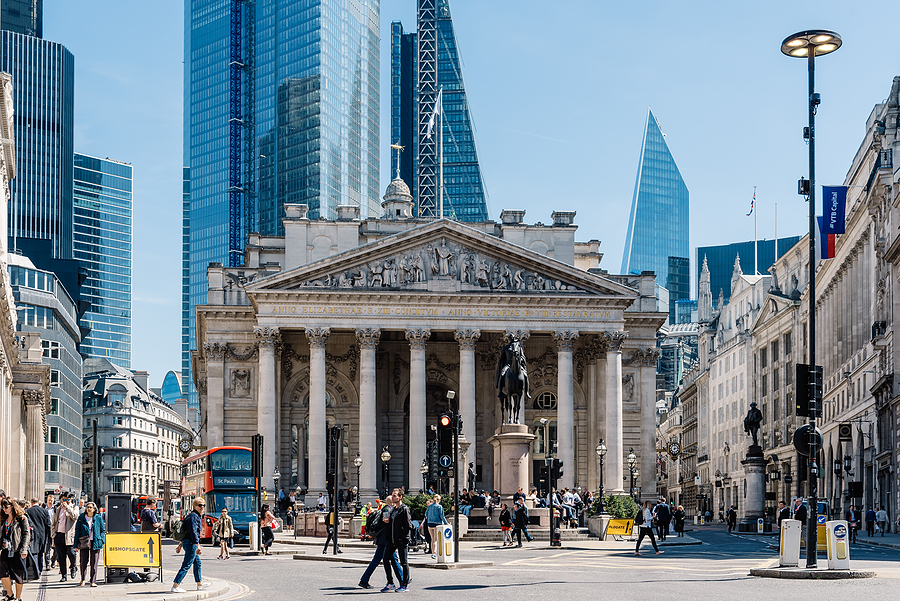 The Royal Exchange and the Bank of England located in the City of London.