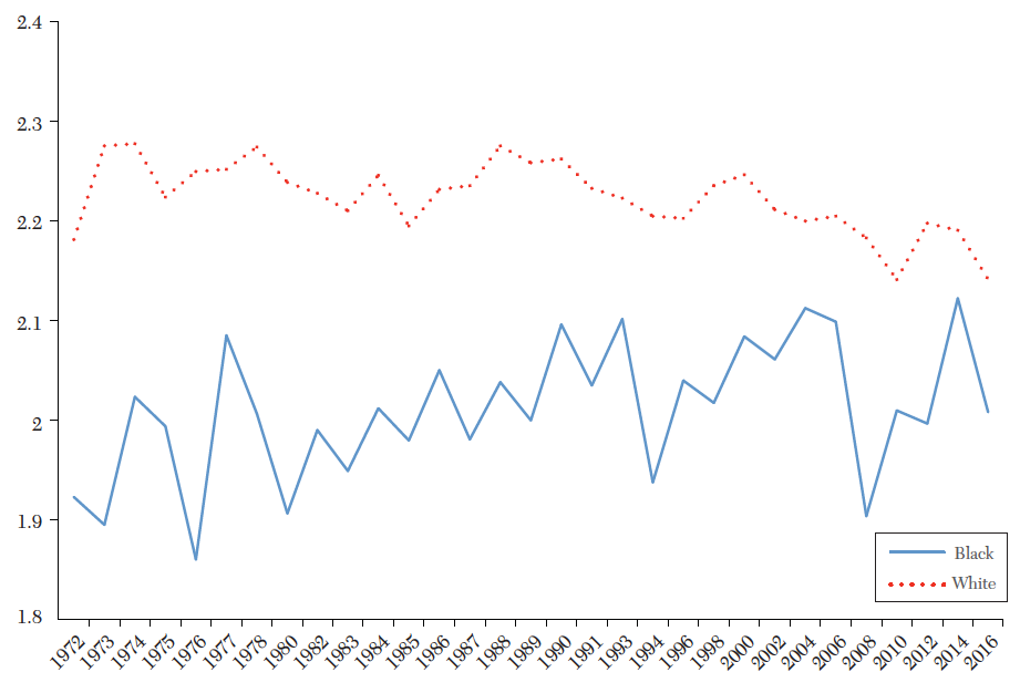 In the early 1970s, Black Americans reported low feelings of happiness, averaging 1.9. But their wellbeing increased in the decades that followed until they were nearly as happy as white Americans in 2016. Meanwhile, whites had a slight decline over the same period. The pattern is a sharp contrast to the larger thesis of the book about the growing inequalities in life satisfaction, a pattern that while true of different education levels does not seem to hold up for racial differences.