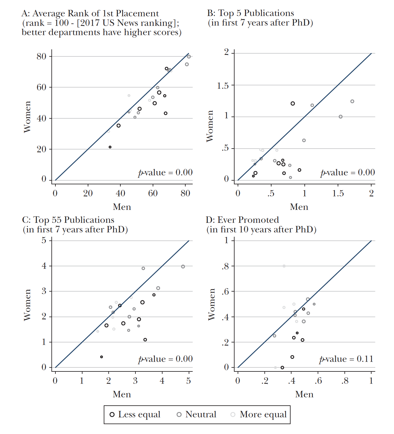 Panel A shows that women placed in lower-ranking departments on average, as indicated by the circles below the diagonal line. Panels B and C show that they also tended to have fewer publications after graduating. And finally, Panel D shows that the share of women who were promoted in the ten years after their PhD is much lower compared to men, especially women who graduated from less equal departments.