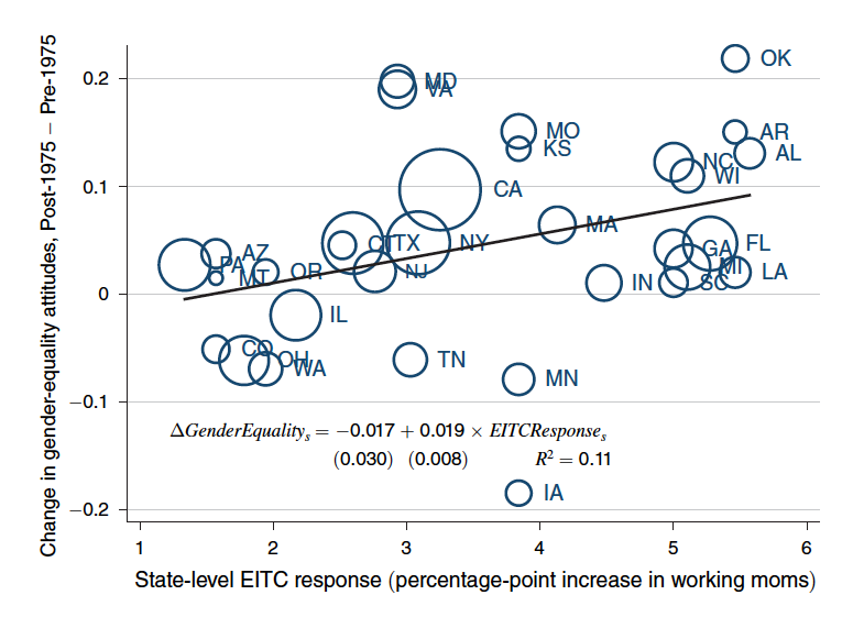 Figure 7 from Bastian’s paper shows the impact that the EITC had on social attitudes around women in the workplace. States where the tax credit had the biggest impact on bringing mothers into paid work—like Oklahoma, Arkansas, and Alabama— also had larger shifts in preferences for gender equality, as reported in the General Social Survey. Bastian collected 8,713 survey responses between 1972 and 1985 to analyze how gender-equality preferences changed after the tax credit went into effect. Each percentage-point increase in working moms (plotted along the x-axis) in a given state led to a 1.9-percentage-point increase in the fraction of the state’s adults that approved of working women. (The size of each bubble is correlated to the state’s population.)
