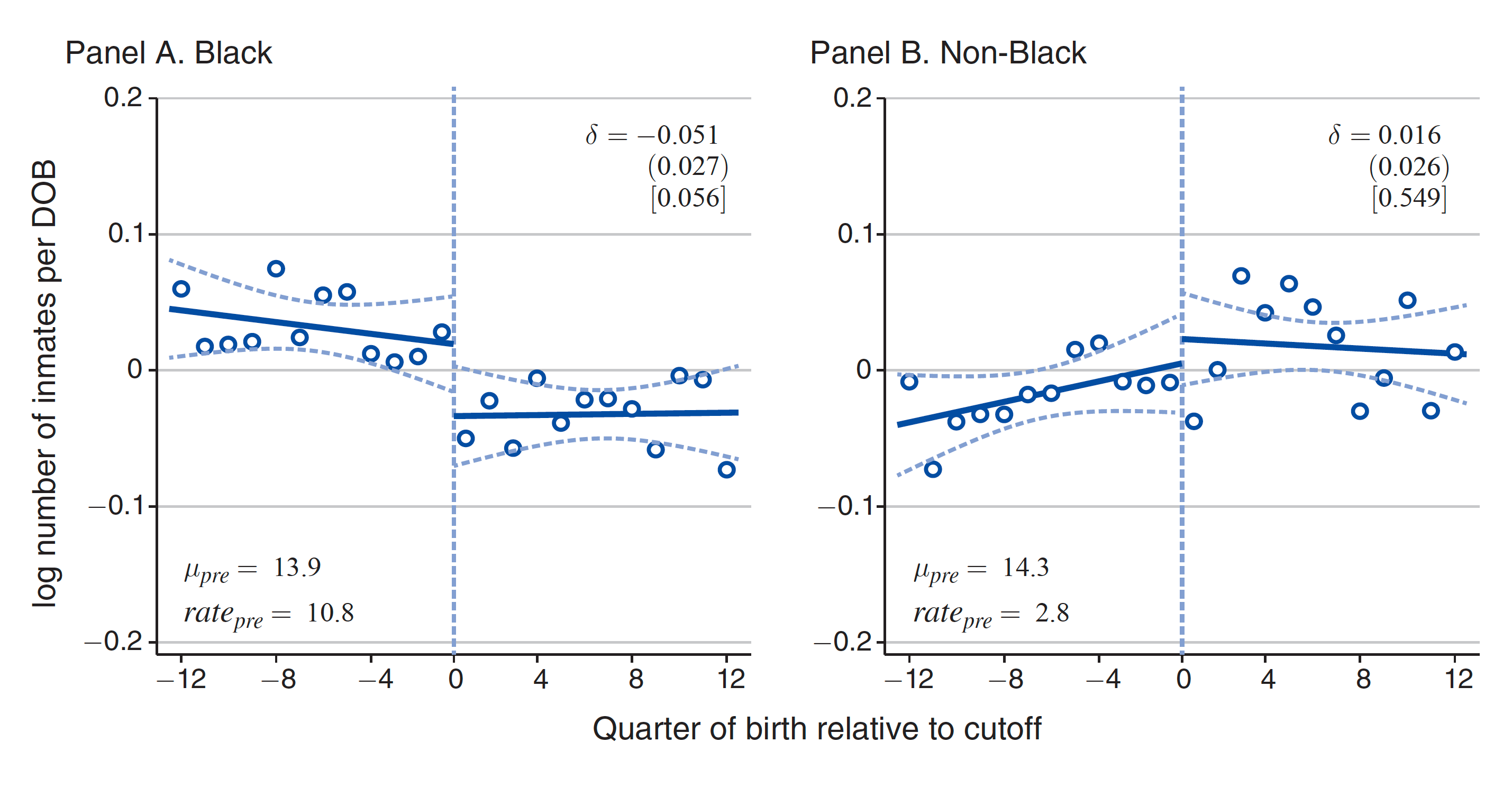 Each blue hollow dot represents the three-month binned average of the logarithm of the number of inmates in the sample by date of birth relative to the cutoff. The solid blue lines are lines of best fit, while the dashed curves are 95 percent confidence intervals. The vertical dashed line indicates the eligibility cutoff date for the Medicaid program—September 30, 1983.