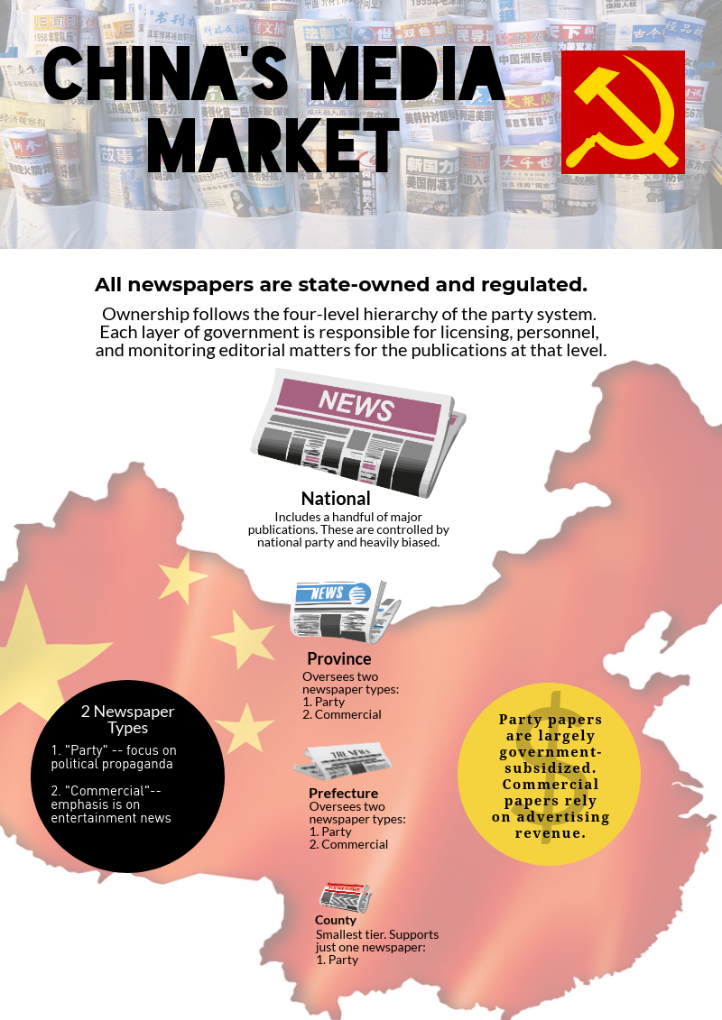 All Chinese newspapers are owned and regulated by the Communist party, with oversight of smaller papers delegated to lower tiers of government. The papers are supported through advertising revenue, however, giving the local owners a strong incentive to sell newspapers. It is a system that attempts a tricky balance between regulating information while keeping some aspects of market competition.