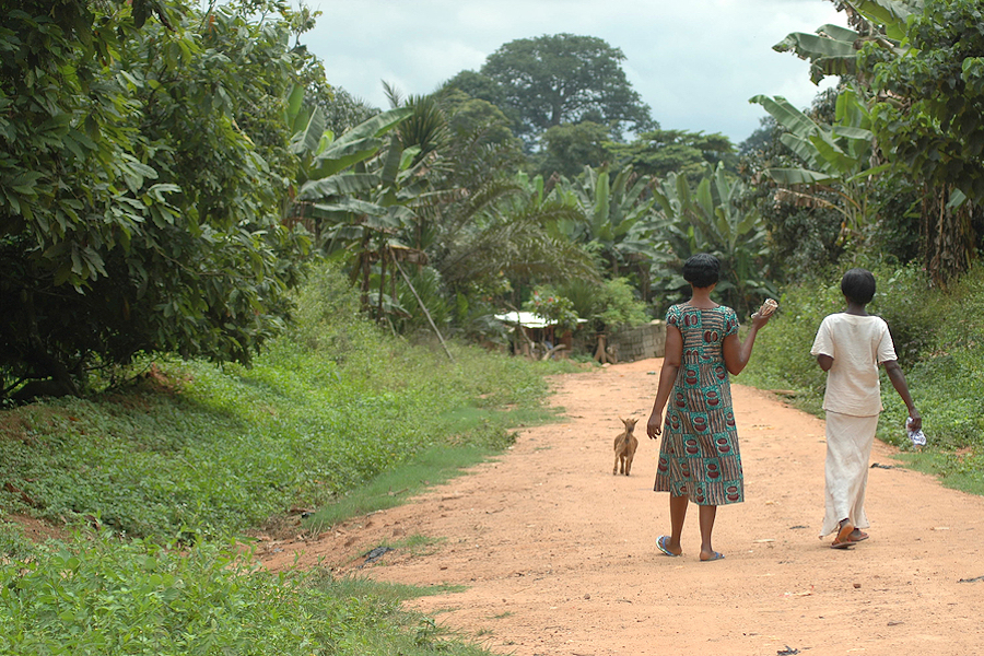 Two women walk down a dirt track in Ghana's countryside.