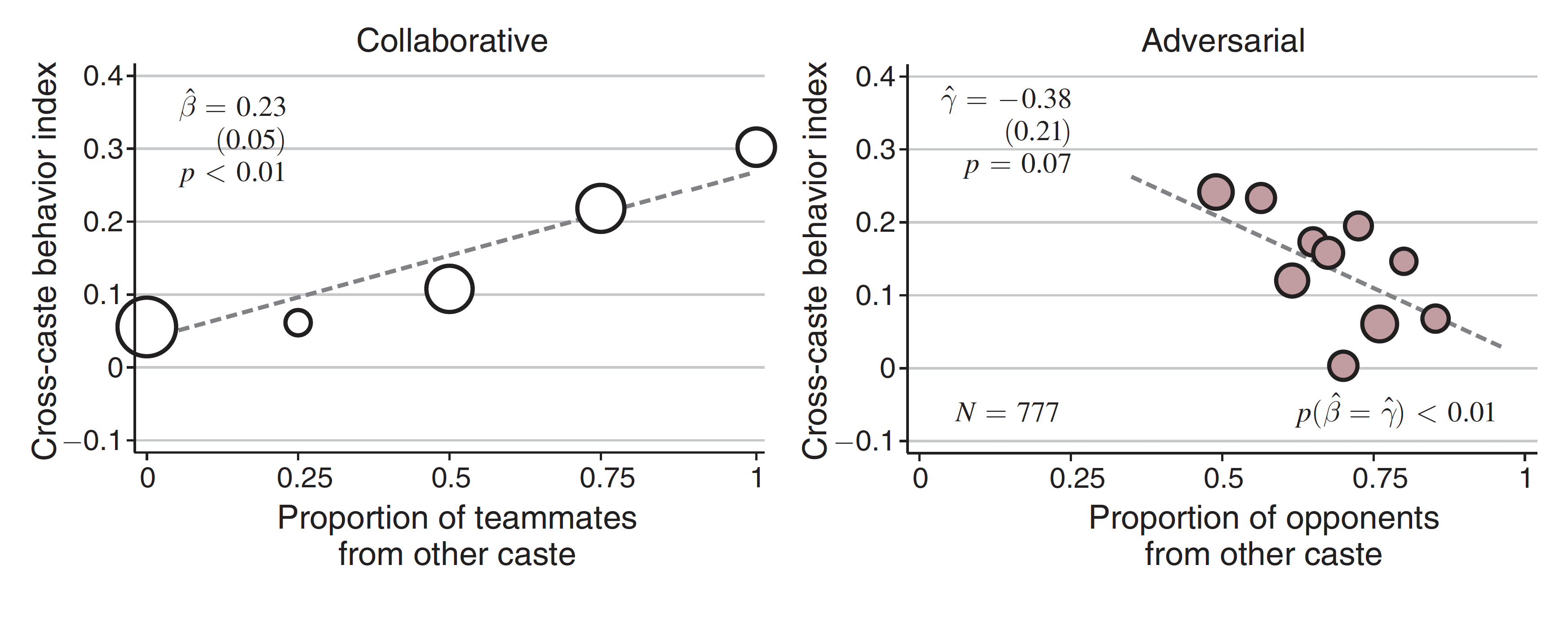 After league play concluded, players were asked who their friends were. Lowe found that having all other-caste teammates instead of none increased the number of other-caste friends by one, while having all other-caste opponents instead of none decreased the number of other-caste friends by 3.5.