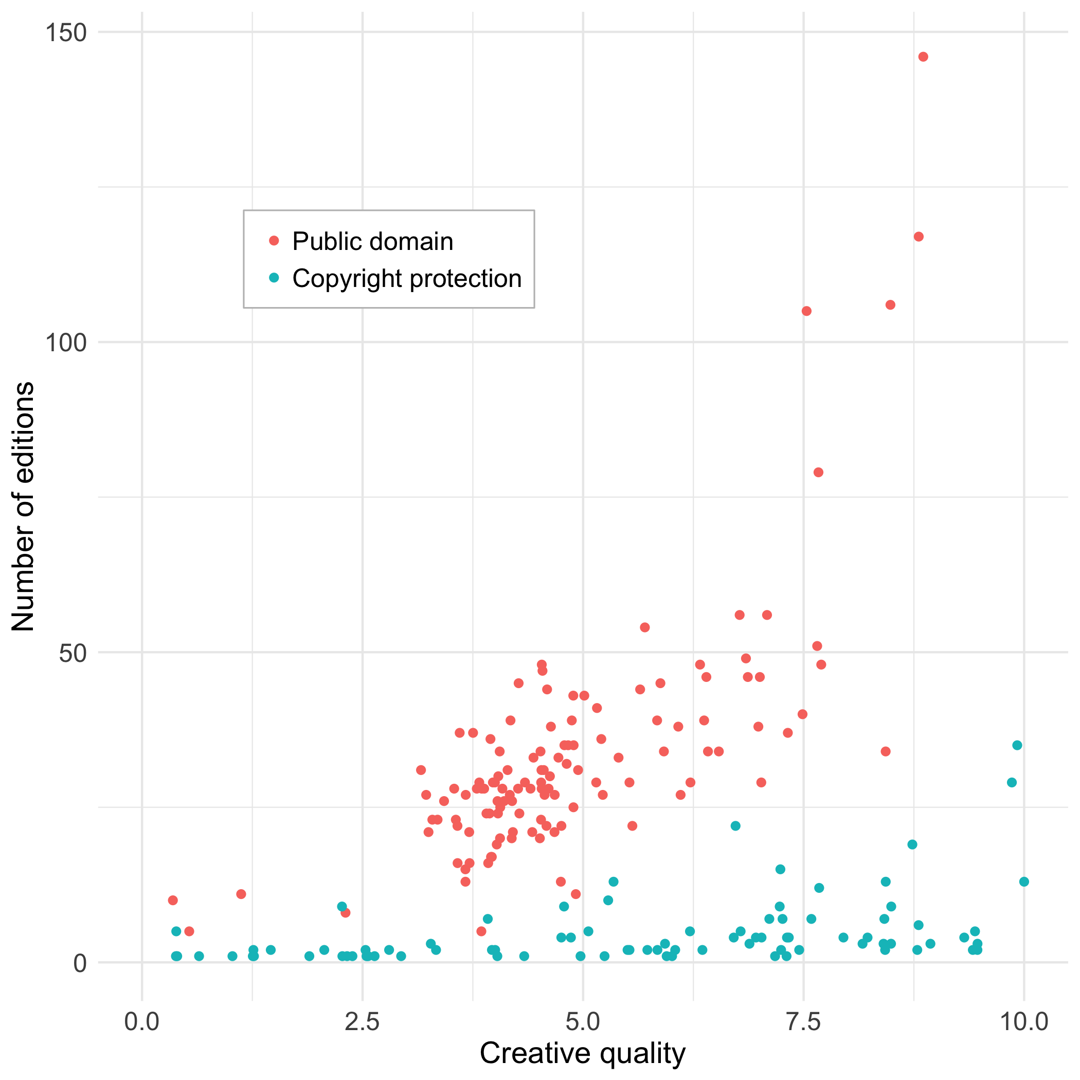 The chart below shows the relationship between a title’s creative quality—measured by library checkouts and literary recognitions—and the number of editions for both copyright regimes. The differences in availability are most pronounced for the highest quality works.