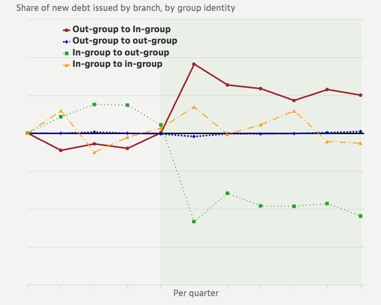 There was no change when borrowers who were in the outside group stayed that way with a new officer at the helm. But new loans made to “in-group” borrowers — those with the same religion and caste as the lending officer — declined immediately when an officer of a different cultural background arrived.