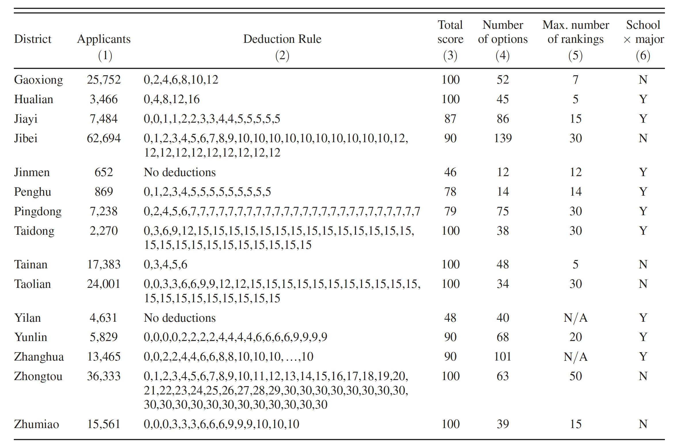 For example, in Jibei, where roughly 60,000 students applied in 2014, the system reduced a student’s score at her second-choice school by one, at her third choice by two, and so on. In Yunlin, the system deducted no points for the first four choices, but deducted two points from choices five through eight.