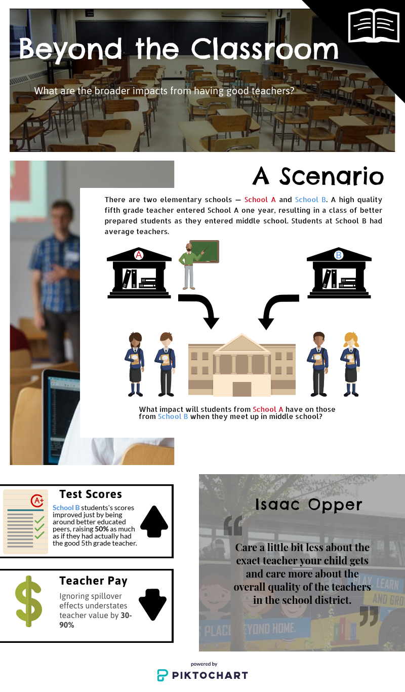 An effective teacher does indeed have an impact beyond their own classroom. Students who were surrounded by peers that were taught by a good teacher in the fifth grade saw nearly as large of an increase in their sixth grade test scores as if they had been taught by the effective teacher themselves.