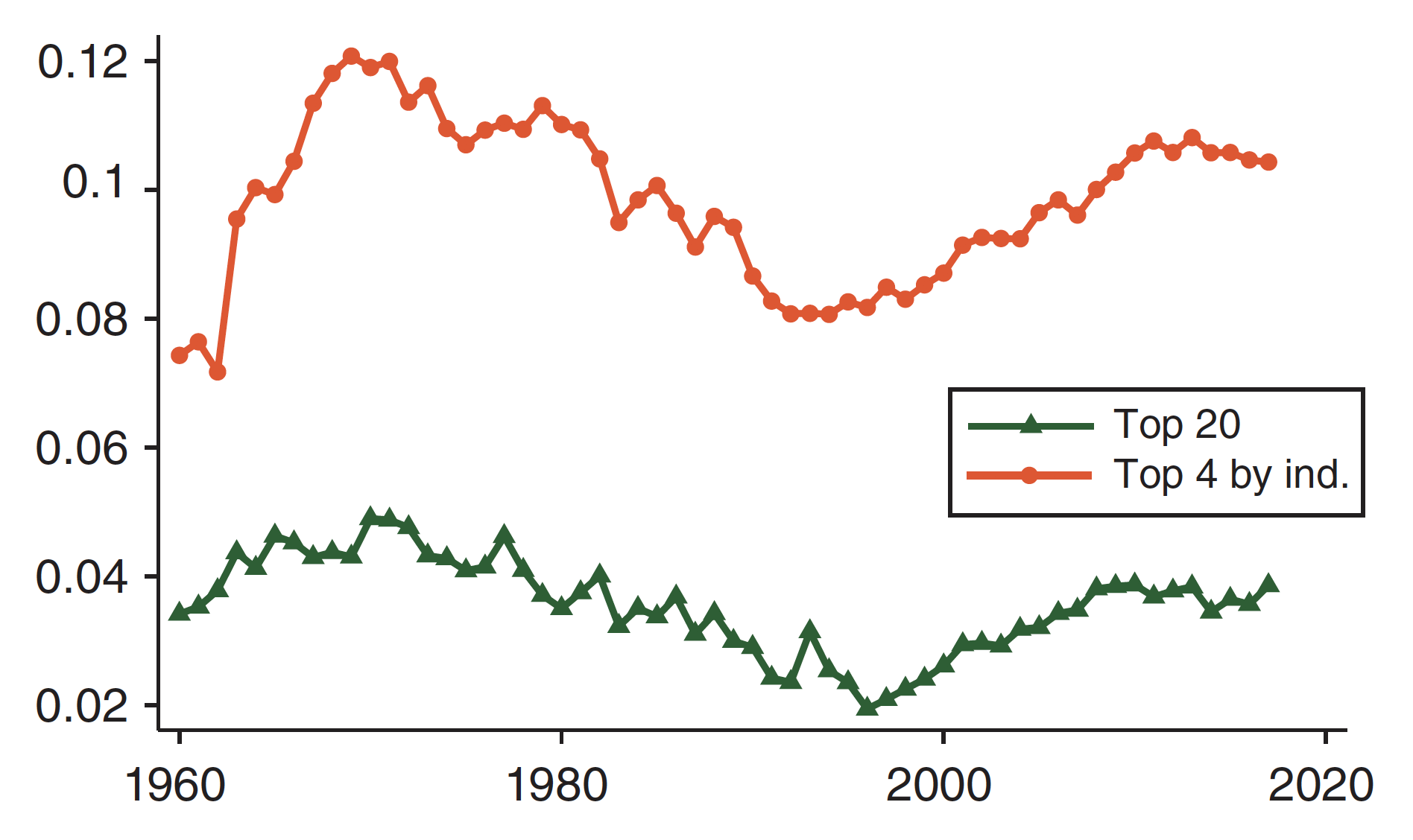 The chart below shows the number of employees at superstar firms over civilian employment from 1960 to 2018. The green line defines the superstars as the top-twenty firms by stock market value. The red line defines them as the top-four firms in every industry by stock market value.