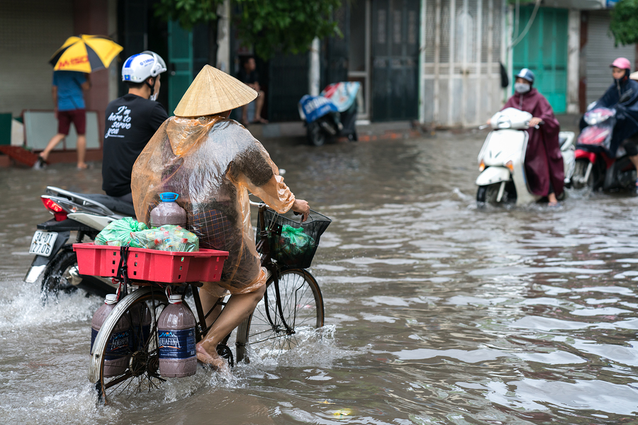 The residents of Hanoi move through flooded streets on July 17, 2017.