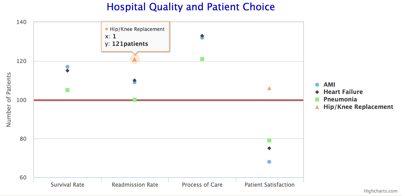 There was a similar relationship between quality and market share for the other conditions studied. Even more, the best hospitals extended their lead over competitors as time went on. A hospital with a survival rate for heart attacks that was 1 percentage point higher than a competitor would have 1.5 percentage points faster growth.