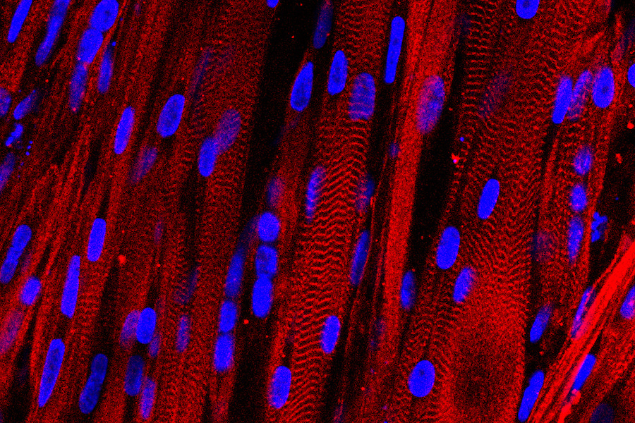 A microscope image of lab-growth muscle produced with funding from the National Institute of Arthritis and Musculoskeletal and Skin Diseases.