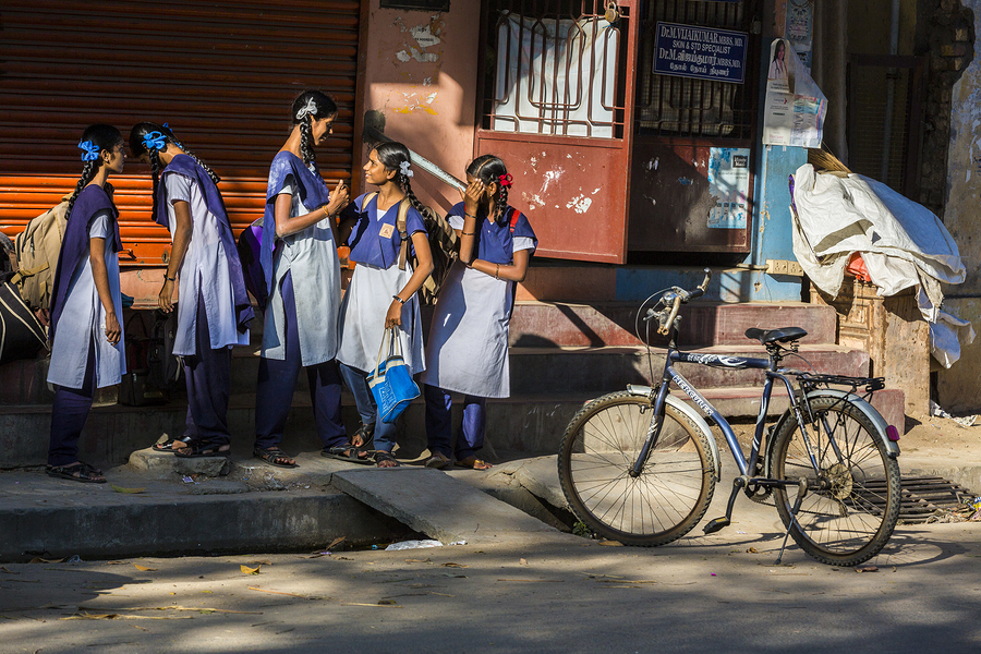 Students wait for class to begin in Pondichery, India, in 2014. A program in the Indian state of Bihar that gave secondary school aged girls bicycles helped boost enrollment.