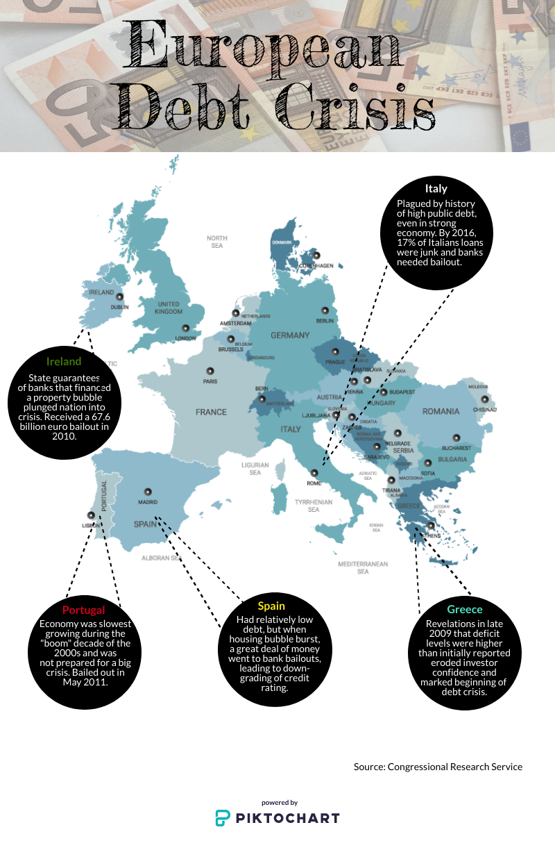 Due to a variety of reasons—sloppy accounting, poor investments, political miscalculations—government bonds in both large and small economies were being shunned by investors. By 2010, Greece, Ireland, and Portugal struggled to refinance their debt; the following year, so did Italy and Spain.