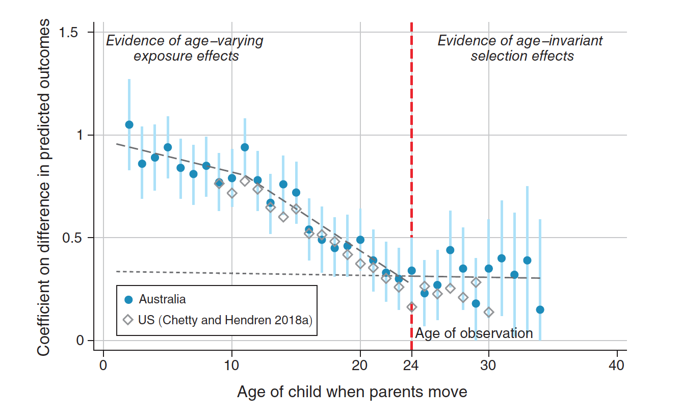 Author Nathan Deutscher found that kids in Australia who moved earlier to places with better outcomes had higher incomes in their 20s compared to peers who moved later in childhood. And while the effects were present throughout childhood—every year in a good neighborhood counts—the biggest impact came after age 11.