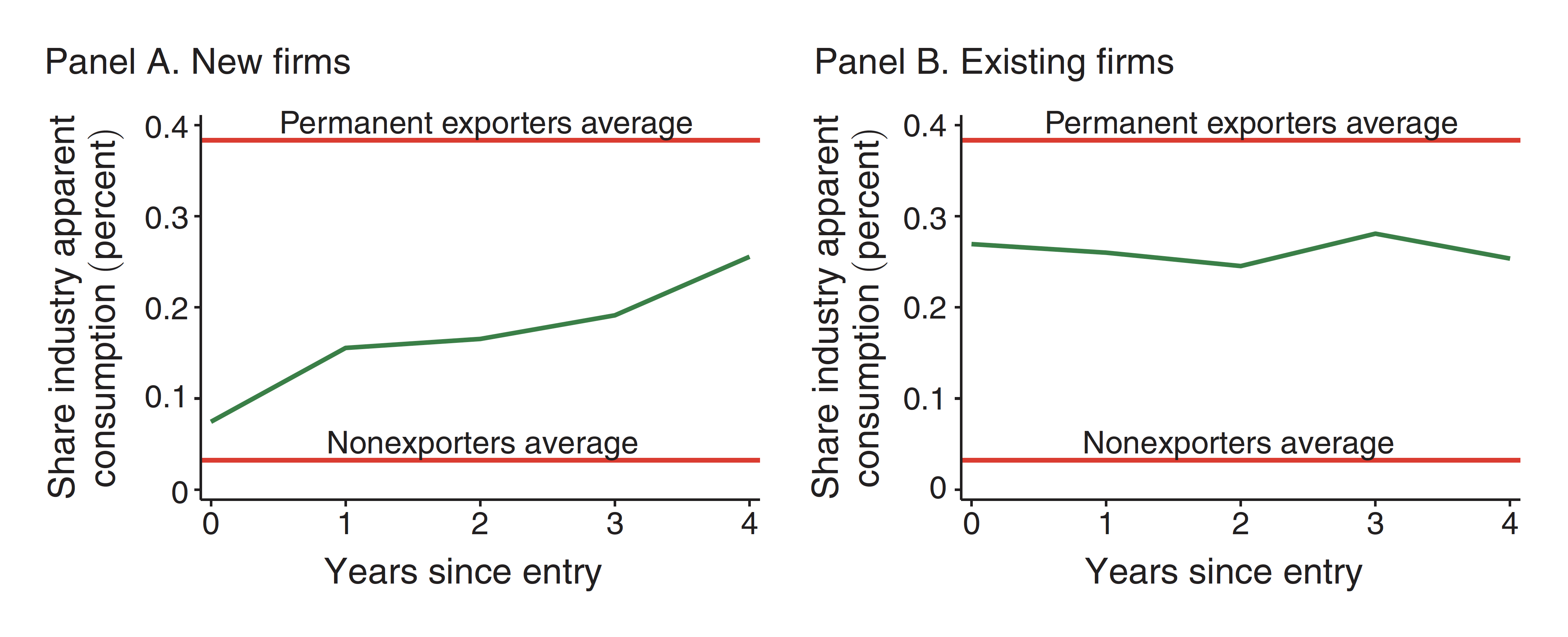 Brand new firms were typically 27 percent of the new exporters, but they accounted for 55 percent of the value sold abroad by new exporters. They also had much higher chances of continuing to export. And in contrast to existing firms, their domestic sales grew rapidly over the first four years of operations.