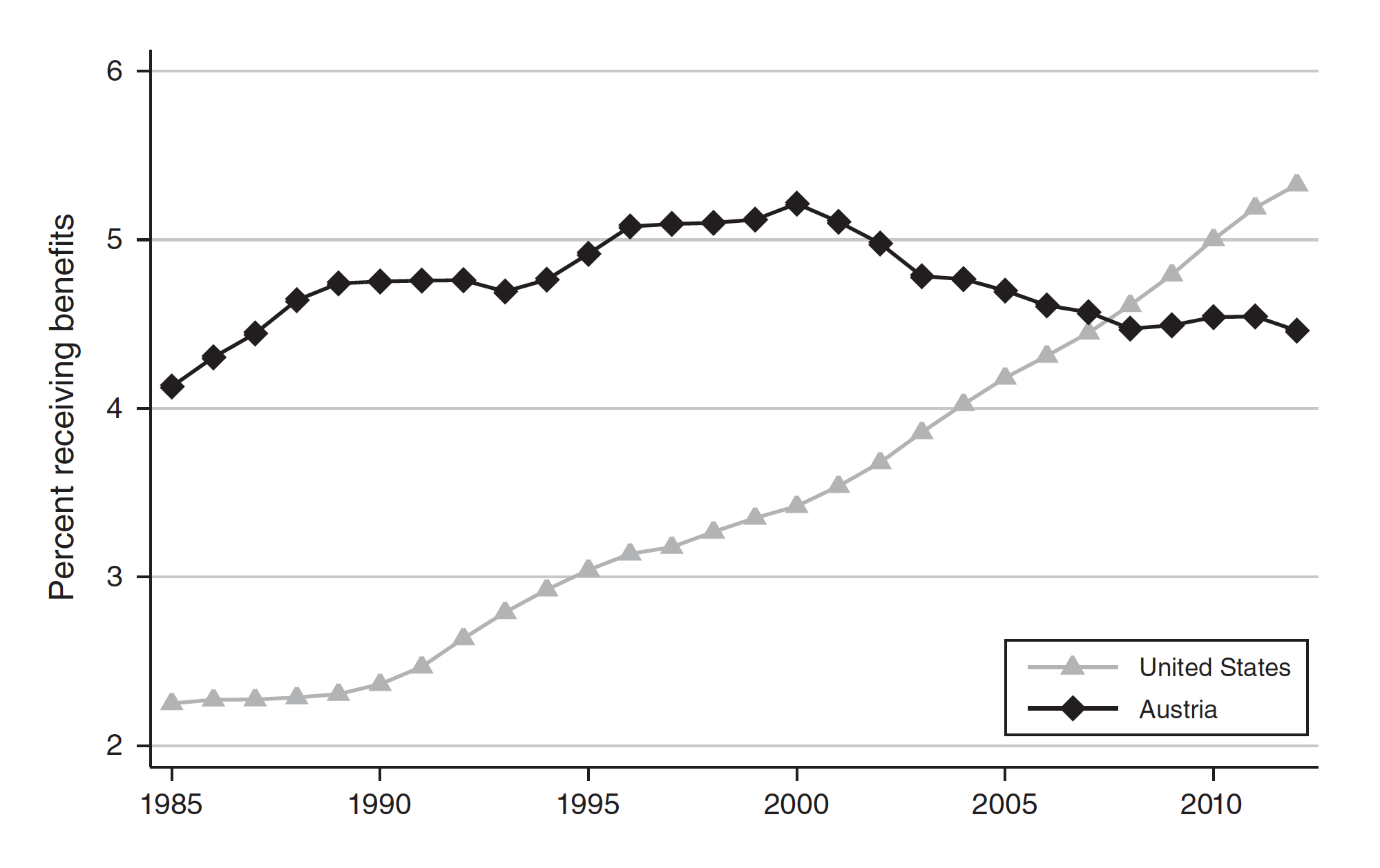 Authors Philippe Ruh and Stefan Staubli looked at a social program in Austria to get a better understanding of how the working disabled get caught between losing benefits and full-time work. They found that a significant number of Austrians on disability from 2001 to 2012 cut back their hours from fear of making too much money and losing their support.
