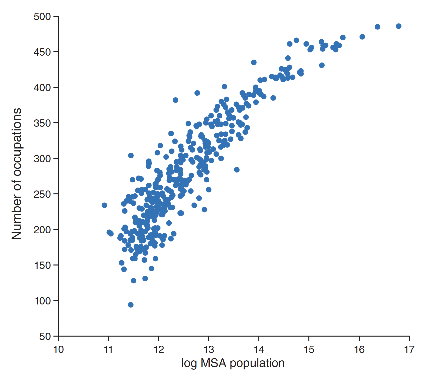 Confirming a common observation, there were more occupations available in large cities than in small cities. For instance, the largest cities had more than 450 occupations, whereas small cities had fewer than 200. And in general, the number of occupations increased by 70 as city-size doubled.