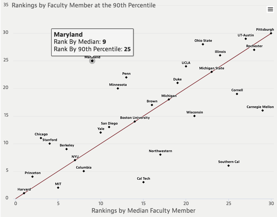 Of course, these conclusions may depend on how people construct citation statistics. Lifetime citations seem objective, but they favor older economists who have had more time to publish than PhD students. Citation information can come from several sources, which do not always come up with the same results. However, the source of the citation information and exact statistics used rarely matter in practice. For example, Hamermesh uses several statistics to examine the productivity of entire economics departments and rank them. Whether ranking a university by the lifetime citations of its median-cited scholar or the scholar at the 90th percentile, the list remains largely the same. Even when adjusting the number of citations to account for age, the rankings do not meaningfully change.