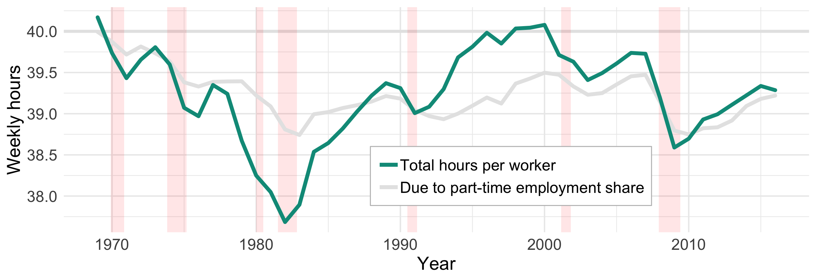 Two hours might not sound like a big difference, but some workers bore much more of the brunt than others. About half of all workers experienced some reduction in hours during recessions.
