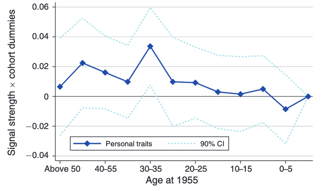 In the 1980 presidential election, a one standard deviation shift in signal strength led to a 1.37 percentage point increase in Reagan’s vote share. The implied “persuasion” rate — the fraction of the G.E. Theater audience who voted for Reagan in response to watching the program—was nearly 12 percent, which is comparable to that of standard political advertisements.