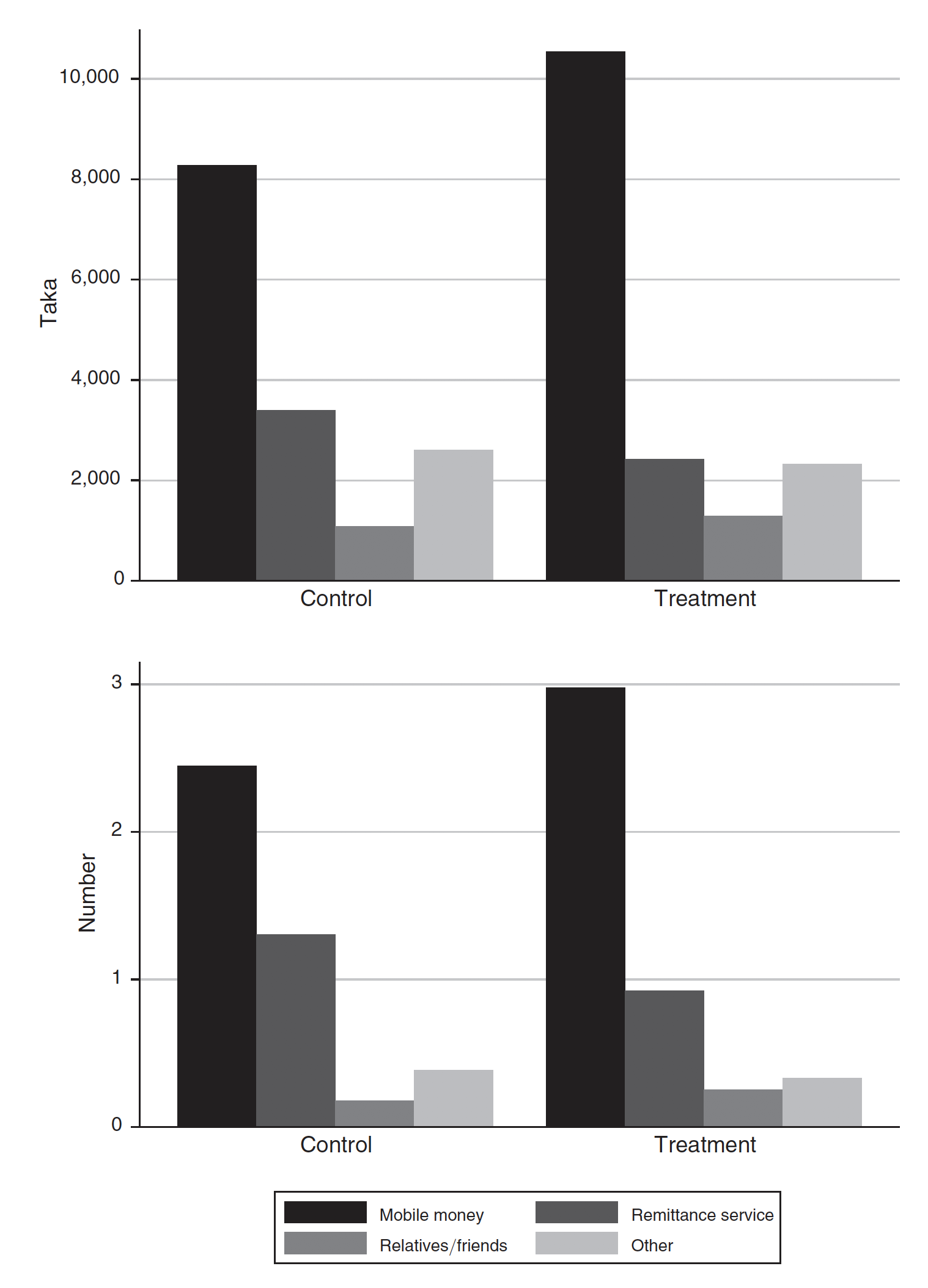 The chart below represents the flow of money to the countryside in the last seven months of the authors' experiment, broken down by the method of transfer. The top panel shows the average amount of money sent (in the Bengali currency, taka). And the bottom panel shows the average number of remittances over the period.