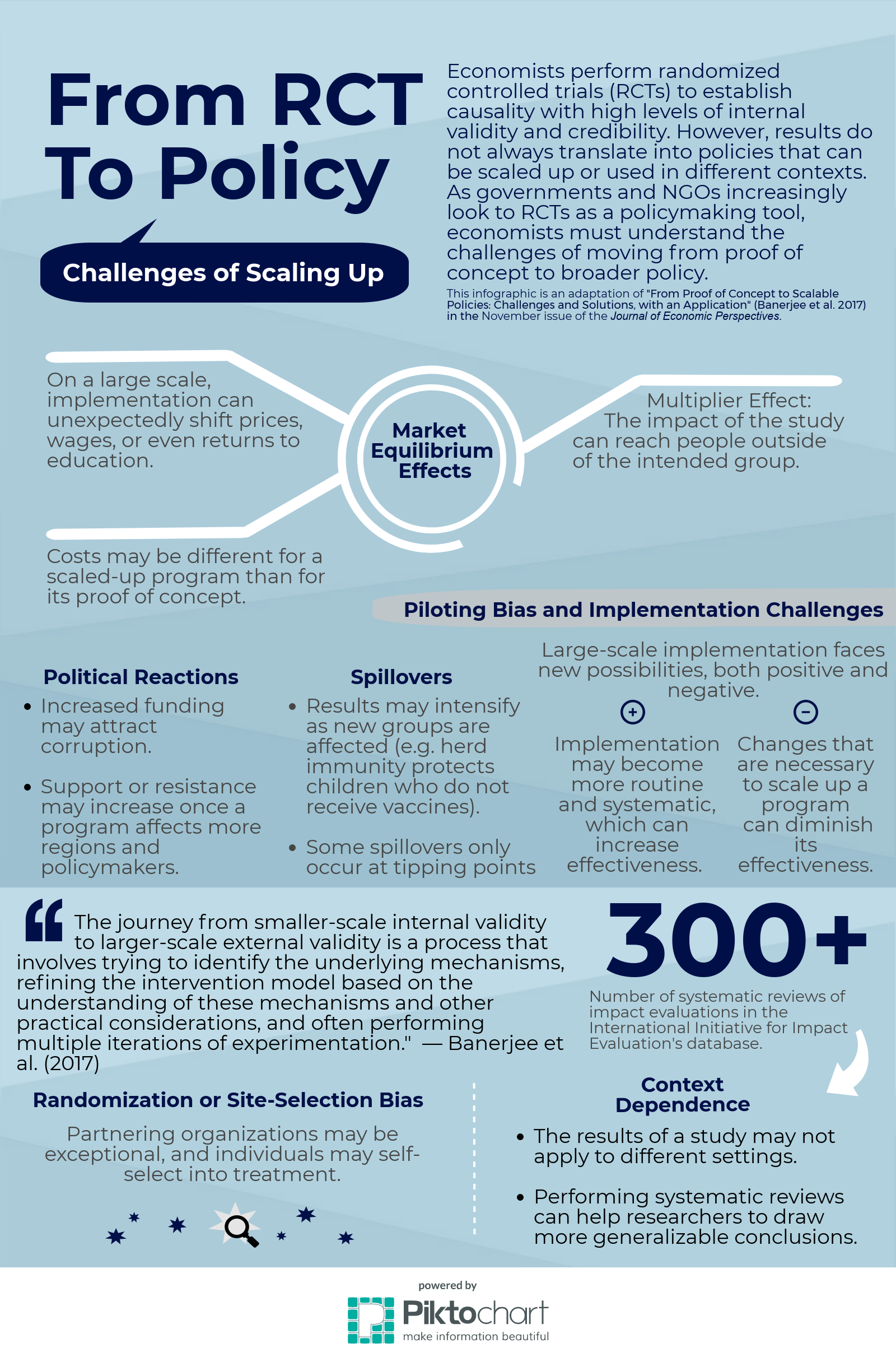 In a new paper in the fall issue of the Journal of Economic Perspectives, authors Abhijit Banerjee, Rukmini Banerji, James Berry, Esther Duflo, Harini Kannan, Shobhini Mukerji, Marc Shotland, and Michael Walton discuss the challenges of scaling up RCTs and how to overcome them. The challenges include corruption, changing costs of implementation, and context dependence. These, among other issues, are further described in the infographic below.