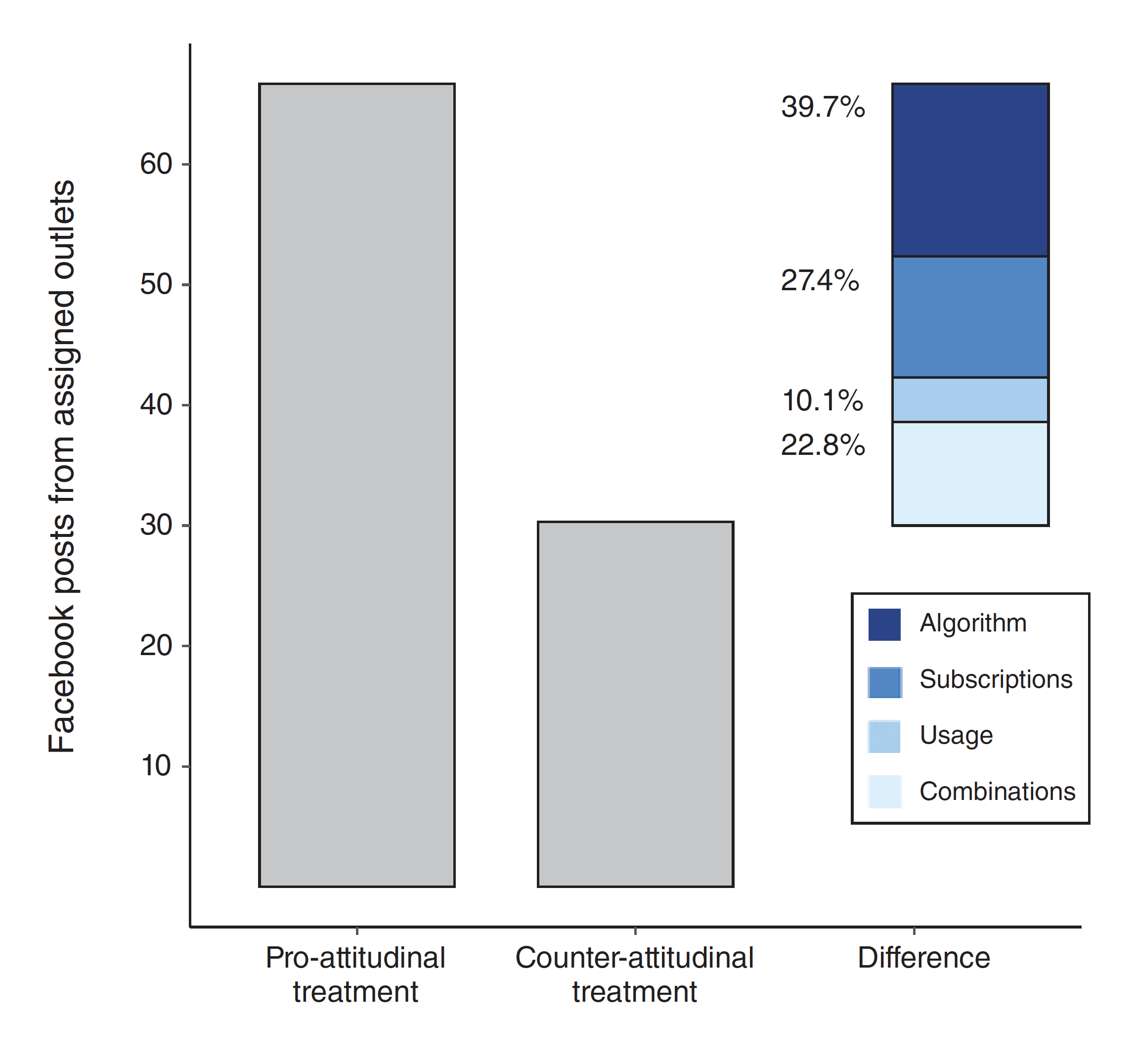 The gray bars in the chart below show the number of posts seen in a user's feed in pro- and counter-attitudinal treatments. The gap between the two is broken down into the share of extra posts from Facebook's algorithm (Algorithm), participants’ tendency to subscribe to more outlets in the pro-attitudinal treatment (Subscriptions), participants’ tendency to use Facebook less often in the counter-attitudinal treatment (Usage), and interactions between these factors (Combinations).