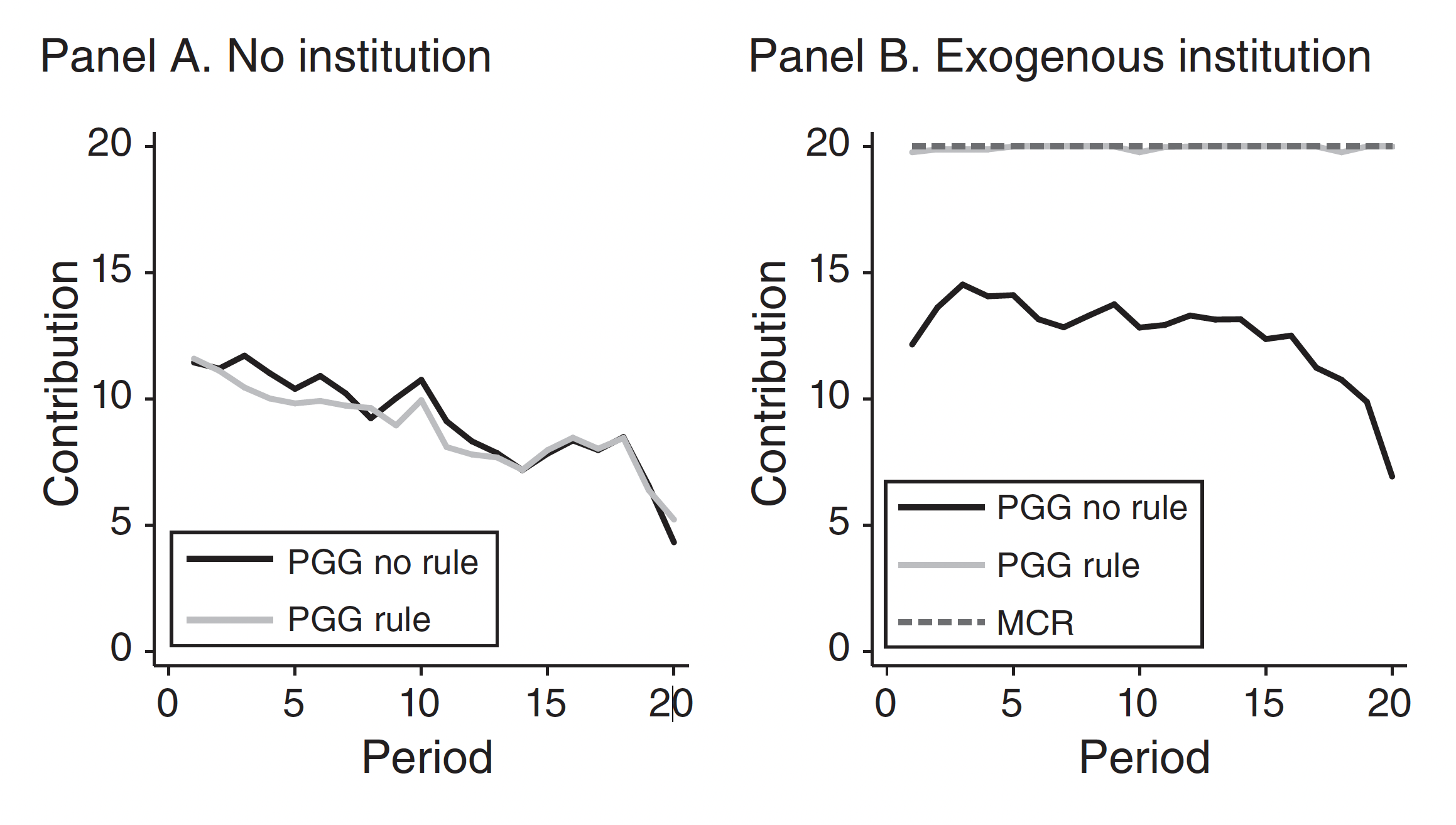Comparing the two groups as they played 20 periods of these simultaneous games, the researchers found that participants who were subject to an enforcement institution in one game tended to contribute more in the game without an institution than participants who never played under an institution.