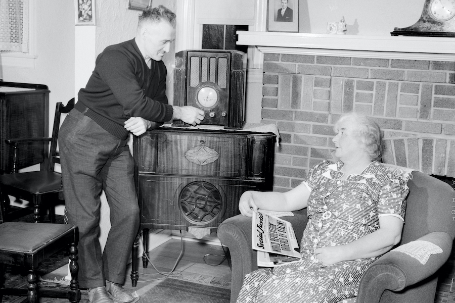 A couple listens to the radio and reads Father Coughlin's newspaper in December 1939.