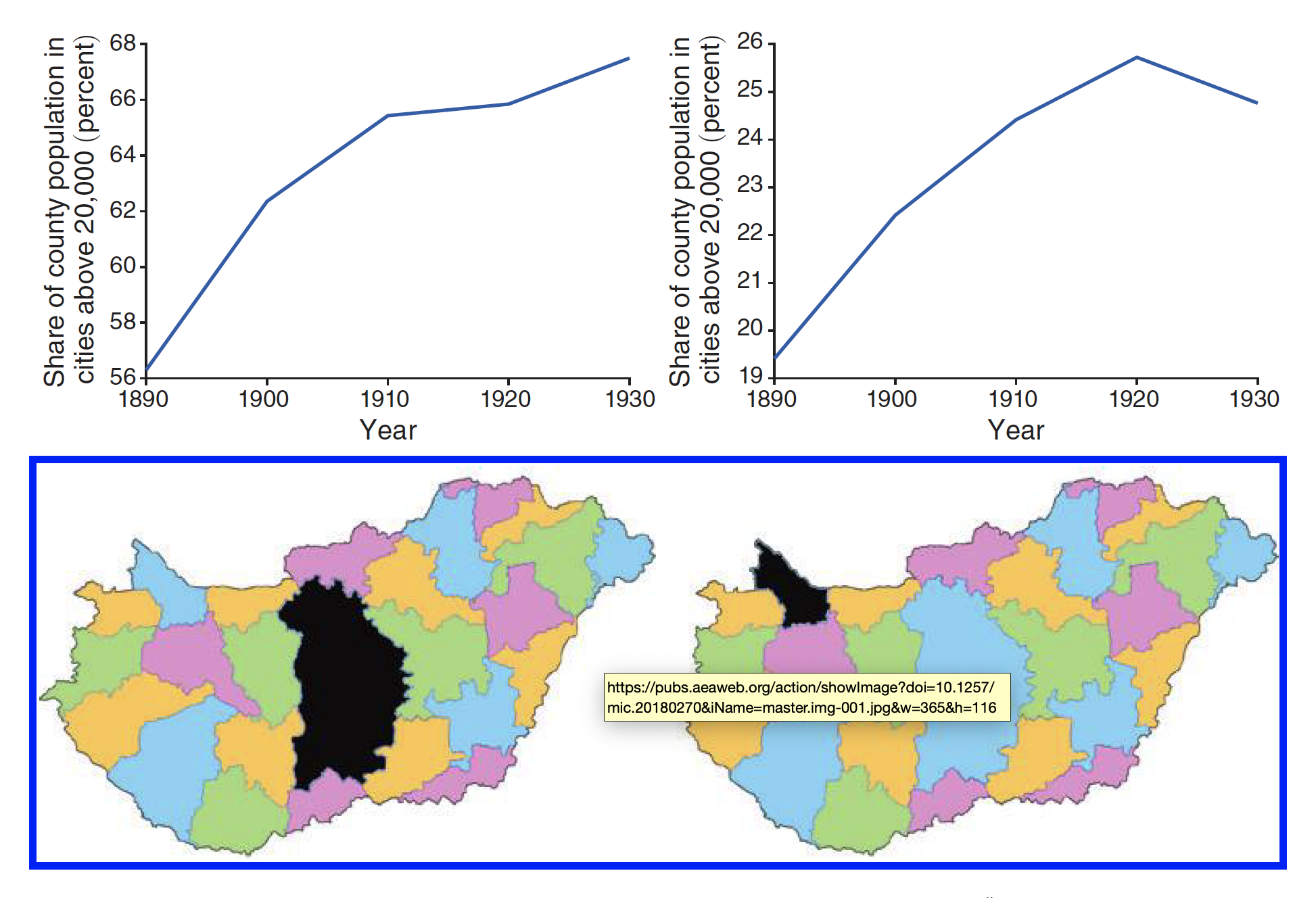 With this evidence that the shape of Hungary’s internal trade was significantly affected by the new borders, Nagy analyzed data on the growth of urbanization in Hungarian counties over this period.