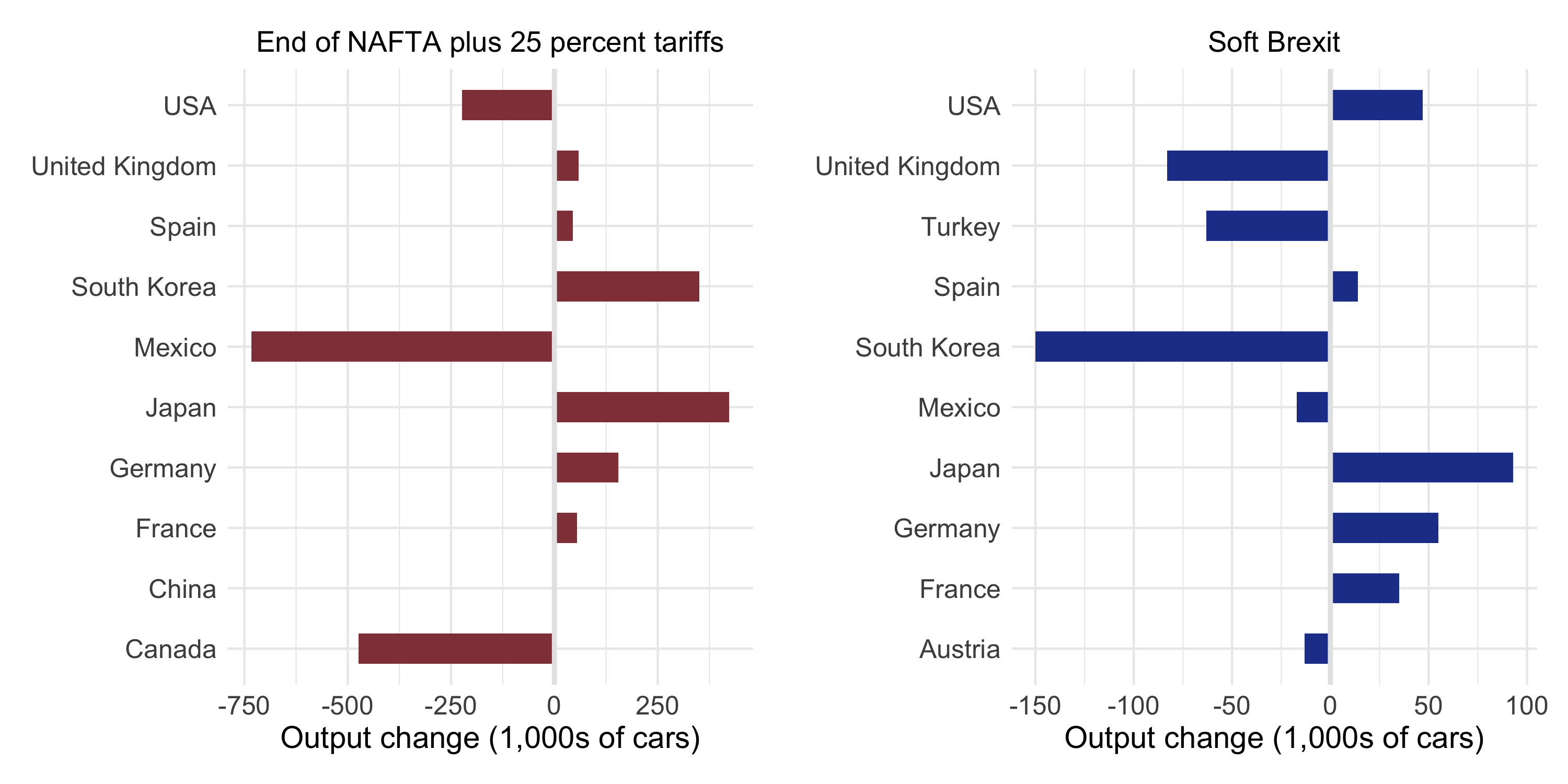 Across the Atlantic, Brexit would have similar, but smaller, effects. Companies like Ford and Nissan would likely switch production to their Spanish factories to serve EU markets tariff-free. And British car sales in Europe would drop by about 260,000 under a so-called “hard” exit, which would at least be tempered by increased production for local markets.