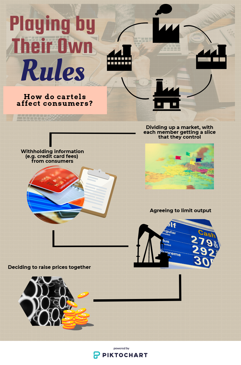 Cartels can have negative effects on consumers. Companies could collude to raise prices together or withhold information from consumers, such as hidden fees on credit card transactions. They might also limit output — as with the oil-producing cartel OPEC — in order to drive prices higher or carve up a market so that competition doesn’t keep prices low.