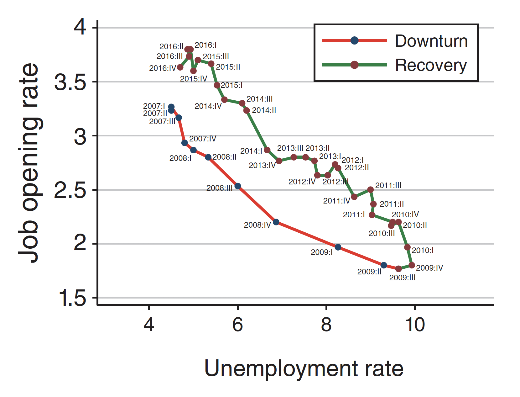 The chart below shows the US Beveridge curve during and after the Great Recession. It plots the number of vacancies per job against the unemployment rate. Each point represents a quarter. The Beveridge curve tends to be lower during downturns, and then shifts outwards during recoveries.