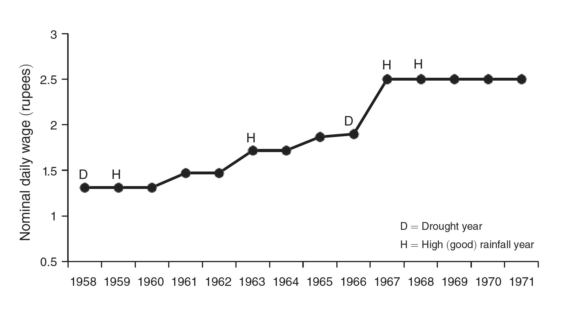 There was clear evidence that employment went down following a year of good rainfall—above the eightieth percentile—because wages were too high. In years with normal rainfall or droughts, agricultural employment was 9 percent lower than it would have been if it hadn't followed a good year.