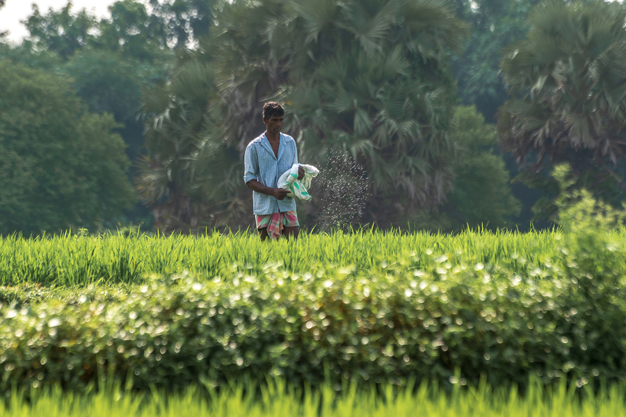 An Indian farmer spraying fertilizer on a farm in West Bengal.
